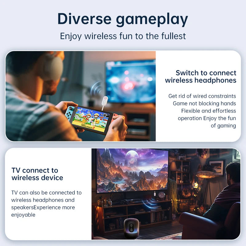 Features1: 3.5mm Aux Bluetooth 5.3 Receiver Transmitter 2-in-1 Wireless Audio Adapter for TV Headset Car Radio Flight Mp3 Player Speaker